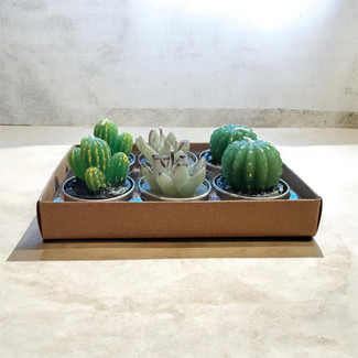 Our assorted cactus tealight candles by One Hundred Degrees are sold in sets of 6 tealights (2 each of 3 styles). They're the perfect candle for just about anywhere, an outdoor patio, breakfast nook, backyard bistro, library, den - you get the idea! Each set of six candles are packaged in a 5.5" wide, 2" tall, and 3.5" deep box tied up with a string! They make a great gift or separate them as party favors or place settings. They are also perfectly matched with our Terracotta tealight pot (sold separately), which combines function and design!