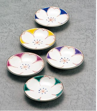This beautiful boxed set of five 4" diameter appetizer plates have a traditional design of the Kutaniyaki porcelain from Japan. Kutaniyaki porcelain has a unique aesthetic that is still valuable hundreds of years later. With bold and gorgeous color, they are illustrated with a simple design of the classic cherry blossom flower. They can be put on display or used on a daily basis. Great for tea, or small appetizers. This set of brightly colored works of art portrays five different colors - red, green, yellow, purple and navy blue - they are sure to add color and beauty to your dining table!