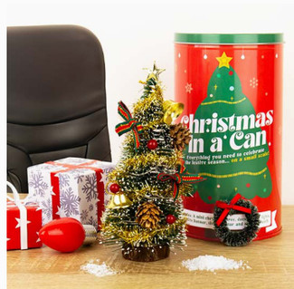 Say hello to “Christmas in a Can” - your small-sized ticket to full-blown Yuletide cheer, no matter where you are! Whether you’re at the office or simply struggling for space at home turn your space into a merry oasis and spread some holiday cheer. This 4" diameter and 7.5" tall tin contains a mini Christmas tree, decorations, lights, a festive banner, tinsel, star and a mini wreath!