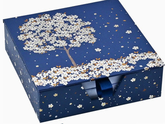 Beautiful designer box keeps its matching memo sheets -- for notes, reminders, ideas, and more -- at your fingertips! Desk Notes set contains 250 note sheets. Keepsake box depicts a tree in bloom, petals whirling through a deep blue sky. Gold foil highlights add eye-catching detail. Ribbon tab adds a touch of elegance. Magnetic closure secures your note set. Floral design is replicated on the corners of each note sheet. Desk Notes set complements home and office workspaces.