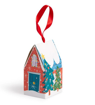 The Tree Decorating 130 Piece Puzzle Ornament from Galison is both an ornament to hang on the tree and a mini puzzle. The puzzle features a brightly colored mini house-shaped ornament, festooned with Christmas Trees, ornaments and lights in Christmas brights. The puzzle pieces are boxed in a 3" wide by 5" tall by 2.5" deep charming little house ornament decorated for the holiday. Ornament includes red string for hanging. Makes a perfect gift! Finished puzzle size is 6" by 8.25" and ornament box includes red grosgrain ribbon for hanging. Includes insert with full puzzle image. The mini 130 piece puzzle captures an outdoor tree decorating moment under the stars.