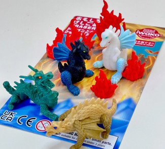 Puzzle erasers from Iwako, made in Japan. The dragon eraser card contains 4 different eraser dragons along with 4 eraser flames. Four different colored dragons included in the set and each one measures approximately 1.5" tall. Each dragon is a puzzle that can be taken apart and put back together. Perfect for stockings, school giveaways and party favors!