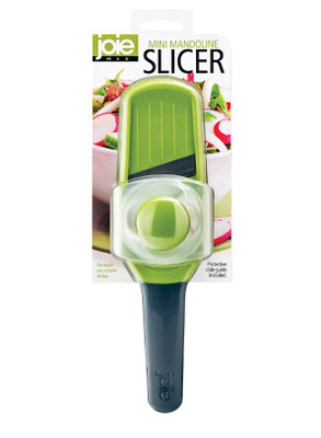 Joie's Mini Straight-Blade Mandoline Slicer creates perfectly even slices quickly and easily. It's ideal for smaller fruits and vegetables. This hand-held (2.5"w x 8" tall) mandoline is a useful kitchen gadget for creating quick healthy meals, like stir fry, side dishes, salads, garnishes, snacks, and more. It includes a straight-edge stainless steel blade that slices in both directions to save precious food preparation time. Plus, it stays sharp and resists rust. The safety guard holds smaller pieces to reduce food waste and protect fingers.