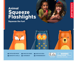 These friendly forest creatures light the way! Adorable flashlight for kids. No more being afraid of the dark! No batteries needed, just a few squeezes to power up. Perfect for late-night reading, camping, or imaginative play.
