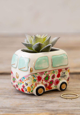 This little van planter with a succulent is the CUTEST thing ever! Tiny faux succulent and heartfelt sentiments bring warmth and life into any space! The perfect gift for that favorite teacher or colleague. The adorable (reusable) hand painted ceramic tiny van planter itself is only 1.75" wide by 3.5" tall (including the succulent) and 2.5" deep and has the words "live happy" in tiny letters imprinted on the side.