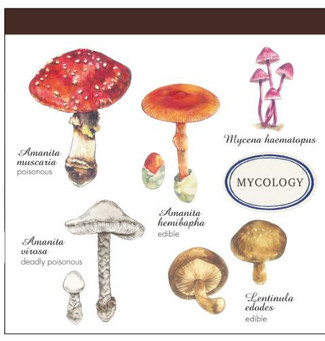 For the mycologist in the family - or the one who is intrigued by fungi, this cute 4" square working notepad is a must-have! Perfect size for doodling, writing TODO notes or keeping it professional at work. The plastic overlay cover depicts a variety of mushrooms and the pad contains 4 patterns of illustrations on the 100 sheets of paper provided. Distributed by Green Flash's Study Holic series.