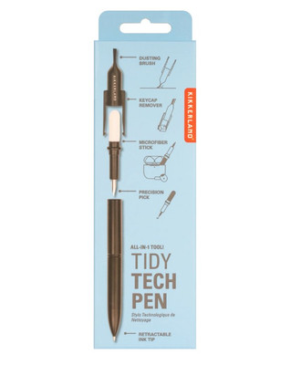 This all-in-one tech cleaning pen from Kikkerland is a versatile tool featuring a microfiber stick, precision pick, keycap remover, dusting brush, and retractable ink tip that all fit together to form a pen. Pen is 6.25" long and gift box measures 2.25" wide, 7.5" tall and 1" deep.