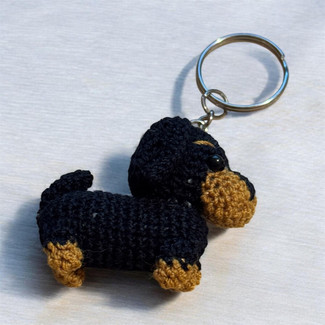 This super adorable hand crocheted Dachshund key ring is a must-have for any dog lover! Measuring a petite 1" wide, 1.75" tall and 2" long, it's the perfect keyring for your keys or to just hang onto your backpack or purse. With classic black & brown coloring, you won't want to leave home without it.