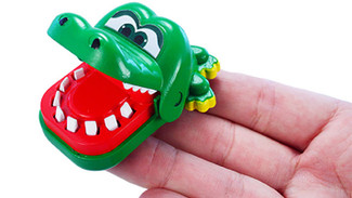 The world’s smallest version of the popular game of nerves and luck. Open the Croc’s mouth wide, and “examine” his teeth by pressing down on them one by one. But watch out! Be the player to press on the crocodile’s sore tooth and you’ll get chomped!